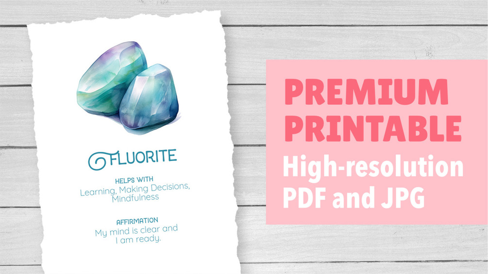 Premium printable crystal card with watercolor image of Fluorite. This crystal helps with focus and clarity.